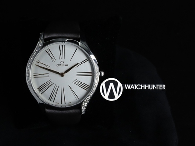Steel on Fabric strap 428.17.39.60.02.001 DESCRIPTION OMEGA has a long tradition of creating beautiful watches for women. In this contemporary collection, each watch has been crafted with a pure design and a truly modern edge. The slim 39 mm case is made from stainless steel and features diamond paving that curves along each side, as well as a crown that is polished with red "HyCeram" and set with a single diamond. The lacquered opaline silver dial includes embossed 18K Sedna™ gold Roman numerals, which is the same material used for the hands. The watch is driven by the OMEGA calibre 4061, which sits behind a special mirrored caseback with a “Her Time” pattern. Finally, the watch is presented on a grey fabric strap.