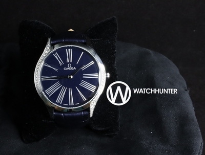 DESCRIPTION OMEGA has a long tradition of creating beautiful watches for women. In this contemporary collection, each watch has been crafted with a pure design and a truly modern edge. The slim 36 mm case is made from stainless steel and features diamond paving that curves along each side, as well as a crown that is polished with red "HyCeram" and set with a single diamond. The lacquered blue dial includes unique transferred Roman numerals and rhodium-plated hands. The watch is driven by the OMEGA calibre 4061, which sits behind a special mirrored caseback with a “Her Time” pattern. Finally, the watch is presented on a blue leather strap.