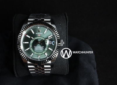 High-flying The Oyster Perpetual Sky-Dweller in Oystersteel and white gold with a mint green dial and a Jubilee bracelet. Sky-Dweller technical details Reference 336934 Model case Oyster, 42 mm, Oystersteel and white gold Oyster architecture Monobloc middle case, screw-down case back and winding crown Diameter 42 mm Material White Rolesor - combination of Oystersteel and white gold Bezel Fluted, bidirectional rotatable Rolex Ring Command Winding crown Screw-down, Twinlock double waterproofness system Crystal Scratch-resistant sapphire, Cyclops lens over the date Water resistance Waterproof to 100 metres / 330 feet Movement Perpetual, mechanical, self-winding, dual time zones, annual calendar Calibre 9002, manufacture Rolex Precision -2/+2 sec/day, after casing Functions Centre hour, minute and seconds hands. 24-hour display on off-centre disc. Second time zone. Instantaneous annual calendar at 3 o'clock and rapid-setting of the date. Month display via 12 apertures around the circumference of the dial. Stop-seconds for precise time setting Oscillator Paramagnetic blue Parachrom hairspring. High-performance Paraflex shock absorbers Winding Bidirectional self-winding via Perpetual rotor Power reserve Approximately 72 hours Bracelet Jubilee, five-piece links Material Oystersteel Clasp Folding Oysterclasp with Easylink 5 mm comfort extension link Dial Mint green Details Highly legible Chromalight display with long-lasting blue luminescence |