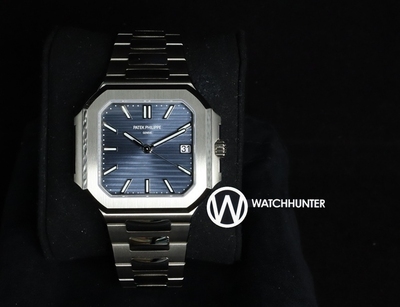 Cubitus in a medium size The Cubitus offers its “casual chic” style in a medium-size version (40 mm diagonal) designed to suit all wrists. The unusual geometry of the white gold case with its square shape, rounded corners and elegant profile is highlighted by the contrast between vertical satin-brushed and polished finishes. The dial with its horizontally embossed pattern features a subtle sunburst blue-gray hue. Technical characteristics DialSunburst blue-gray, horizontally embossed, white gold applied baton-style hour markers with white luminescent coating. White gold rounded baton-style hands with white luminescent coating. CaseWhite gold. Diameter (10-4 o'clock): 40 mm. Thickness: 8.5 mm. Water-resistant to 30m. Screw-down crown. Sapphire crystal case back. BraceletWhite gold. White gold fold-over clasp. Lockable adjustment system. Movement26-330 S C Self-winding Sweep seconds Diameter: 27 mm. Thickness: 3.59 mm. Number of parts: 219. Number of jewels: 30. Power reserve: min. 35 hours – max. 45 hours. Winding rotor: 21K gold central rotor. Gyromax®. Frequency: 28,800 semi-oscillations/hour (4 Hz). Balance spring: Spiromax®. Distinctive sign: Patek Philippe Seal. |