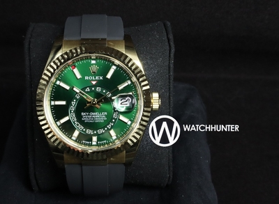 High-flying The Oyster Perpetual Sky-Dweller in 18 ct yellow gold with a bright green dial and an Oysterflex bracelet. technical details Reference 336238 Model case Oyster, 42 mm, yellow gold Oyster architecture Monobloc middle case, screw-down case back and winding crown Diameter 42 mm Material 18 ct yellow gold Bezel Fluted, bidirectional rotatable Rolex Ring Command Winding crown Screw-down, Twinlock double waterproofness system Crystal Scratch-resistant sapphire, Cyclops lens over the date Water resistance Waterproof to 100 metres / 330 feet Movement Perpetual, mechanical, self-winding, dual time zones, annual calendar Calibre 9002, manufacture Rolex Precision -2/+2 sec/day, after casing Functions Centre hour, minute and seconds hands. 24-hour display on off-centre disc. Second time zone. Instantaneous annual calendar at 3 o'clock and rapid-setting of the date. Month display via 12 apertures around the circumference of the dial. Stop-seconds for precise time setting Oscillator Paramagnetic blue Parachrom hairspring. High-performance Paraflex shock absorbers Winding Bidirectional self-winding via Perpetual rotor Power reserve Approximately 72 hours Bracelet Oysterflex Material Flexible metal blades overmoulded with high-performance elastomer Clasp Folding Oysterclasp with Rolex Glidelock extension system Dial Bright green Details Highly legible Chromalight display with long-lasting blue luminescence |