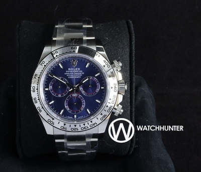 The triumph of endurance This Oyster Perpetual Cosmograph Daytona in 18 ct white gold, with a bright blue dial and an Oyster bracelet, features an 18 ct white gold bezel with an engraved tachymetric scale. Cosmograph Daytona Technical details Reference 126509 Model case Oyster, 40 mm, white gold Oyster architecture Monobloc middle case, screw-down case back and winding crown Diameter 40 mm Material 18 ct white gold Bezel Fixed, with engraved tachymetric scale, in 18 ct white gold Winding crown Screw-down, Triplock triple waterproofness system Crystal Scratch-resistant sapphire Water resistance Waterproof to 100 metres / 330 feet Movement Perpetual, mechanical chronograph, self-winding Calibre 4131, manufacture Rolex Precision -2/+2 sec/day, after casing Functions Centre hour and minute hands, small seconds hand at 6 o'clock. Chronograph via centre seconds hand, 30-minute counter at 3 o'clock and 12-hour counter at 9 o'clock. Stop seconds for exact time setting Oscillator Paramagnetic blue Parachrom hairspring. High-performance Paraflex shock absorbers Winding Bidirectional self-winding via Perpetual rotor Power reserve Approximately 72 hours Bracelet Oyster, three-piece solid links Material 18 ct white gold Clasp Folding Oysterlock safety clasp with Easylink 5 mm comfort extension link Dial Bright blue Details Highly legible Chromalight display with long-lasting blue luminescence |