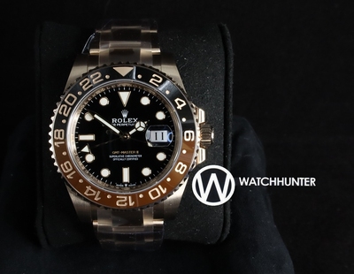 In connection with the world The Oyster Perpetual GMT-Master II in 18 ct Everose gold with a black dial and an Oyster bracelet. GMT-Master II Technical details Reference 126715CHNR Model case Oyster, 40 mm, Everose gold Oyster architecture Monobloc middle case, screw-down case back and winding crown Diameter 40 mm Material 18 ct Everose gold Bezel Bidirectional rotatable 24-hour graduated bezel. Two-colour brown and black Cerachrom insert in ceramic, moulded numerals and graduations Winding crown Screw-down, Triplock triple waterproofness system Crystal Scratch-resistant sapphire, Cyclops lens over the date Water resistance Waterproof to 100 metres / 330 feet Movement Perpetual, mechanical, self-winding, GMT function Calibre 3285, Manufacture Rolex Precision -2/+2 sec/day, after casing Functions Centre hour, minute and seconds hands. 24-hour display. Second time zone with independent rapid-setting of the hour hand. Instantaneous date. Stop-seconds for precise time setting Oscillator Paramagnetic blue Parachrom hairspring. High-performance Paraflex shock absorbers Winding Bidirectional self-winding via Perpetual rotor Power reserve Approximately 70 hours Bracelet Oyster, three-piece solid links Material 18 ct Everose gold Clasp Folding Oysterlock safety clasp with Easylink 5 mm comfort extension link Dial Black Details Highly legible Chromalight display with long-lasting blue luminescence |